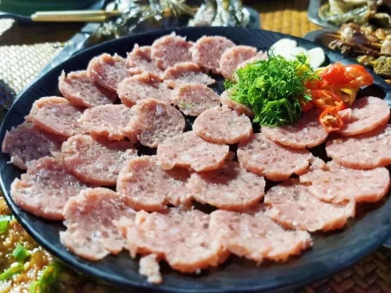 傣族酸肉的制作要選用新鮮的豬肉或者牛肉為原料,把選好的肉進(jìn)行手工剁細(xì),將皮子切條、切丁后將兩者進(jìn)行充分混分,使得肉質(zhì)口感更加Q彈。在制作過程中放入適量食鹽、辣椒、野花椒、蒜瓣等佐料進(jìn)行調(diào)味,再放入少許糯米飯均勻攪拌,裝入壇內(nèi)或竹筒內(nèi)密封腌制3—5天,讓肉呈現(xiàn)出純正的酸味,便可食用。