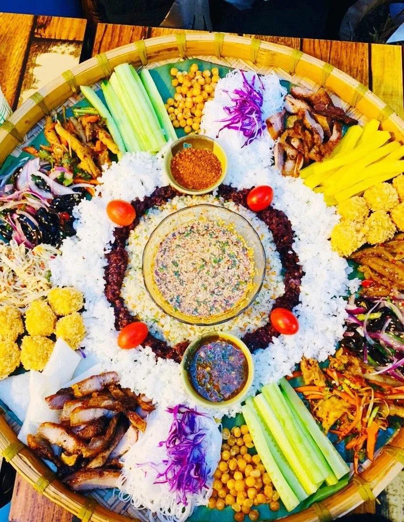 傣味菜以糯米為主食,植物染色的五彩糯米飯,搭配原生態(tài)炭火烤出來的大塊肉,吃起來簡直不要太過癮。