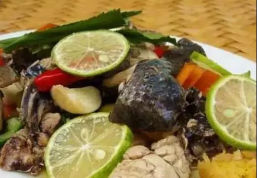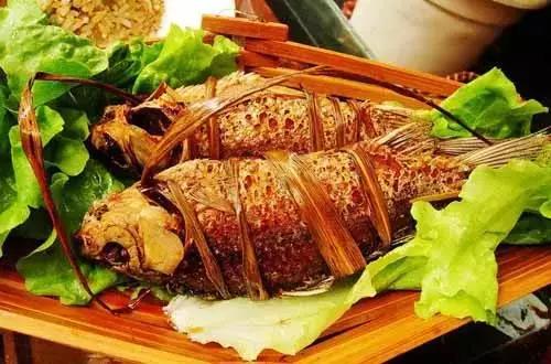 布朗族的傳統(tǒng)名菜,鮮香俱全,味美可口。其制作方法:把魚剖開洗凈,將辣椒、鹽等各種佐料切細(xì)拌勻后填入魚腹內(nèi),再用芭蕉葉包好,捂在火塘的炭火下面,燒熟即可食用