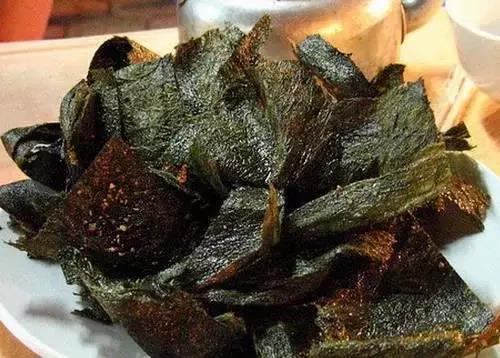 青苔傣語稱為“改”和“搗”,它是從江河里撈出來洗凈后,加工成青苔干片的食用品。油炸青苔傣語稱為“改英”,它的做法是:先將青苔壓成薄餅,撒上細(xì)姜片、鹽、水調(diào)成姜湯,曬干后而成干青苔片。待食用時(shí),用剪刀把干青苔片剪成巴掌大的小塊,丟進(jìn)油鍋里煎黃就可以撈出,當(dāng)作餐桌上的一道菜食用。油炸青苔既香脆,又有海味,是別具一格的傣族風(fēng)味菜。