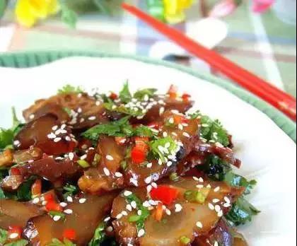 腌牛腳筋是傣族傳統(tǒng)性的一道名菜。其原料是黃牛頭、腳,佐料有姜、蒜、紅辣椒、野花椒葉、鹽等。制作時(shí),將牛的頭、腳、刮洗干凈、砍成小塊,放進(jìn)鍋里煮爛。將煮爛的頭、腳去骨,切成短小的條狀,用淘米水浸泡3小時(shí)后再用冷水洗干凈,濾干。用切細(xì)的紅辣椒、舂細(xì)的姜、蒜、加鹽、野花椒葉一起拌攏,裝入瓦罐封好。半月后即可以食用。滋味酸香,質(zhì)地軟嫩,清涼爽口。