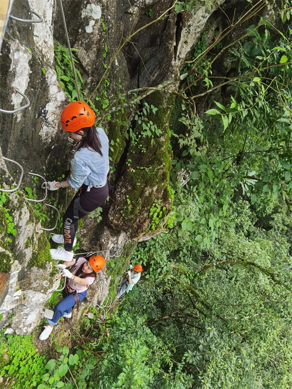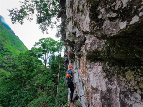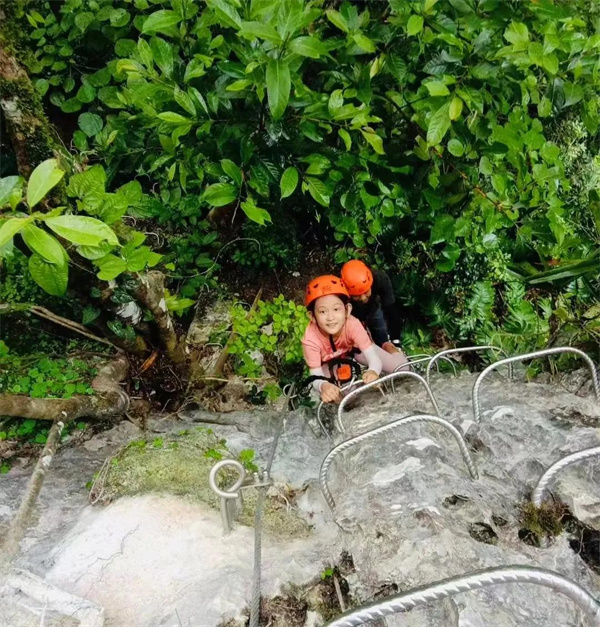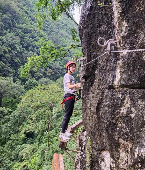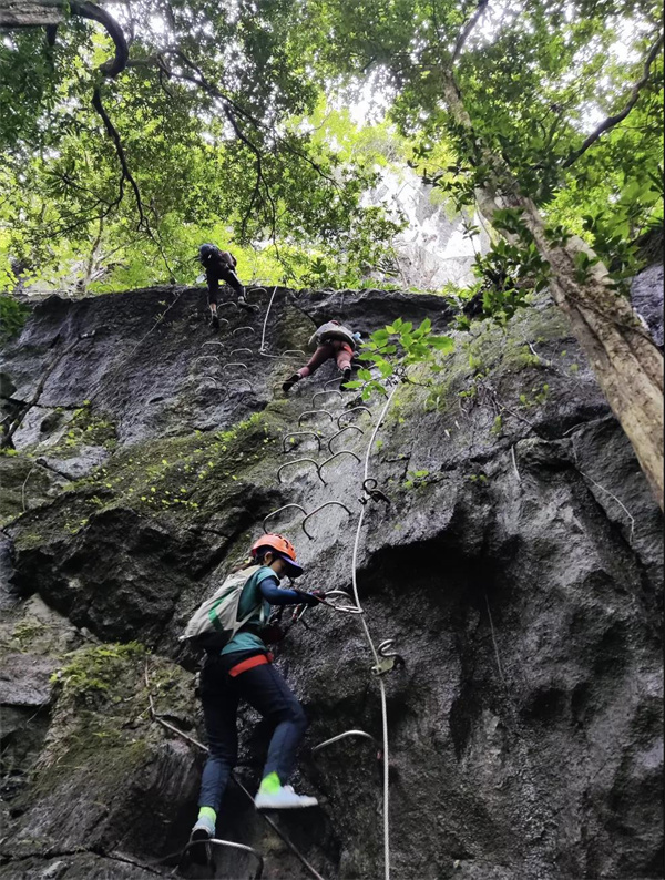 在兩個專業(yè)教練的講解指導下,穿戴配備好相關(guān)安全裝備,沿著石階踏步而上,看著沿途遍地叢生的苔蘚、青苔,原始叢林的幽深茂密展現(xiàn)在眼前,走到飛拉達入口處,抬頭往上,一眼望去都是由鋼扶手、腳踏、生命鋼纜等構(gòu)成的攀登徑道,那種緊張刺激的感覺剎時涌上心頭,教練首先攀爬而上,帶領(lǐng)大家前行,帶你去看不一樣的世界。