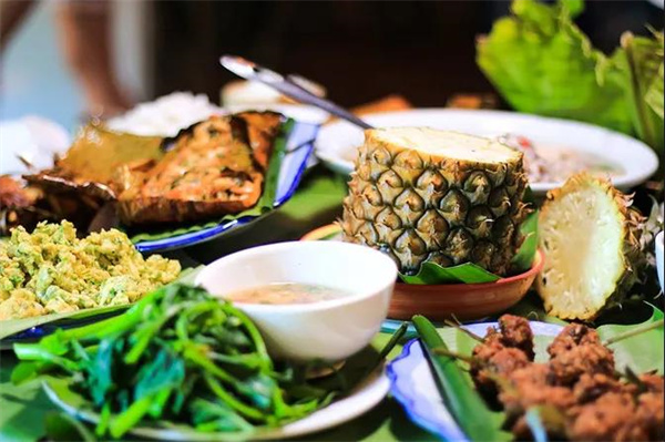 孔雀宴的食材均采用的是德宏本地原生態(tài)食材,包括德宏遮放貢米,德宏竹米,德宏樹毛衣,德宏樹蝴蝶,德宏酸螞蟻等,這些食材不僅僅是純天然無污染,更重要的是這些食材均采自云南德宏的大山。孔雀宴由18種傣族特色菜肴組成:風味炸排骨、炸蝗蟲、炒甜筍、烤魚、烤豬皮、烤五花肉、炸腸子、鬼雞、舂牛干巴、姜絲拌雞樅、炸竹蟲、土豆泥、涼拌刺五加、包燒豆腐、套炸香蕉、雞蛋芭蕉花餅、泡魯達、牛扒乎等組成。當18道美味依次排開,呈現(xiàn)一個孔雀開屏的樣式時,讓人賞心悅目。來過西雙版納旅游的人,對“包燒”一定不陌生。以天然的芭蕉葉為烹飪工具,將食材和佐料包在其中,之后放入炭火塘進行烤制,當打開芭蕉葉的一瞬間,香氣撲鼻,嘗一口酸辣咸香。再加上芭蕉葉的遮掩,每次打開包燒都有一種開盲盒的快感。