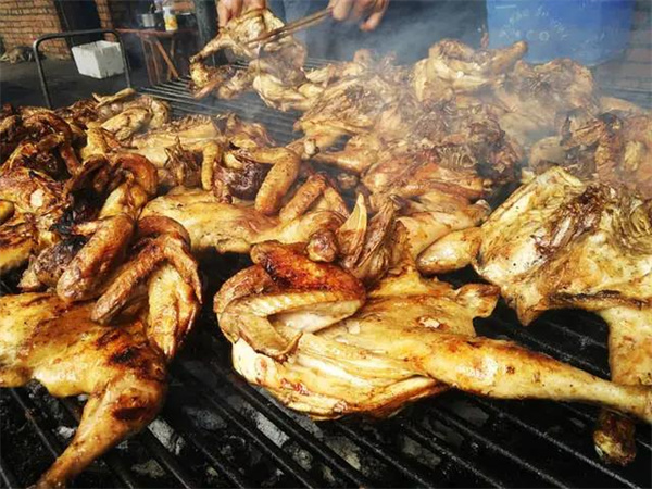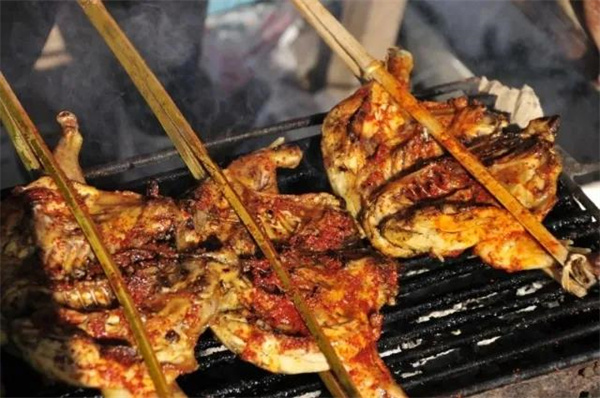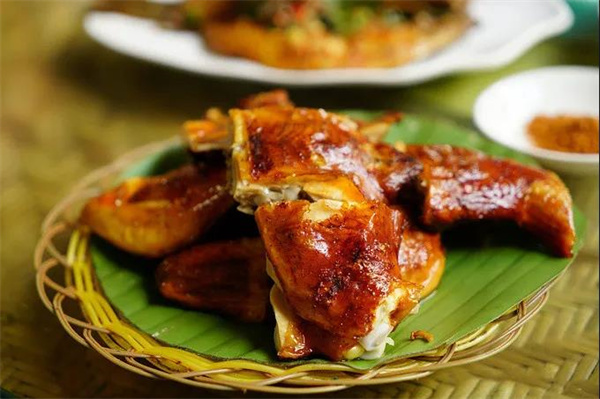 烤雞是傳統(tǒng)傣家烤制菜系里最具特色的菜品,勐海烤雞體型不大,烤過的雞肉外焦里嫩,色澤誘人,是傣家飯桌上最??吹降牟似?。勐海烤雞香而不膩,配合傳統(tǒng)蘸料蘸食,更是香辣美味,和三五好友一起點上幾只,就能感受大口吃肉大口喝酒的快感。