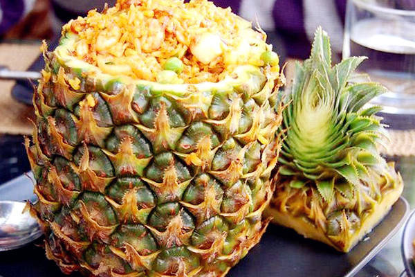 菠蘿飯看起來就很誘人,整個菠蘿很萌的樣子。其做法也很簡單,首先要將紫糯米浸泡7-8個小時,將菠蘿頂端切一個蓋,掏去菠蘿心,放入糯米,蓋上菠蘿蓋后放到甄鍋里煮,聞到香味后,即可開蓋食用。味道有點甜,而且有補血潤肺的功效哦。