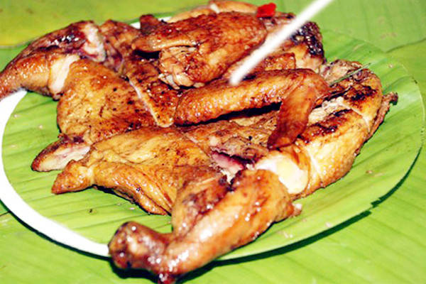 西雙版納的烤雞香辣可口,味道鮮美,頗受歡迎。把宰好的雞洗凈,放在火炭上烘烤至六成熟,然后把肉剔下來,用舂鹽棒捶軟,捶碎。把預(yù)先切好、拌攏的蔥、蒜、芫荽、青辣椒、鹽等拌合在一起,捏成拳頭大的一坨,用洗凈的香茅草捆住,用竹片夾起來,放在火炭上烘烤。