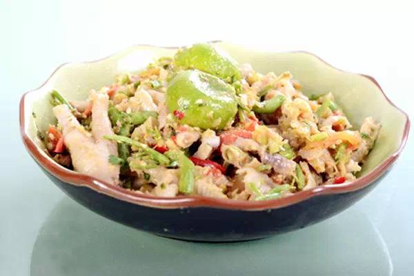 把雞腳放到石臼里搗碎,配上新鮮辣椒、西紅柿、檸檬、鹽、糖、味精、魚露等佐料,用石臼舂成糊狀。舂雞腳口味酸辣,配上小瓶啤酒,吃起來有滋有味。