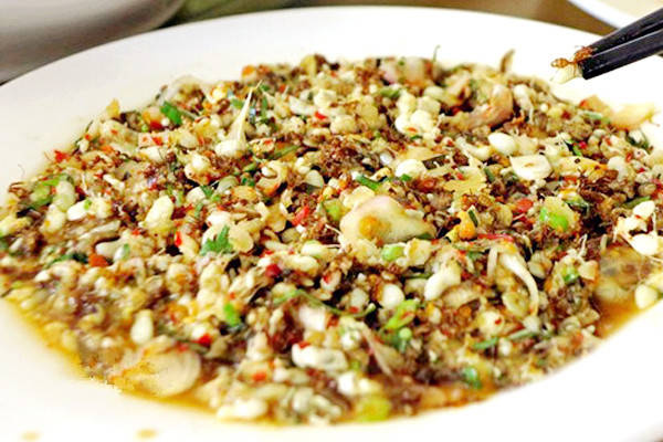 每年三、四月是掏酸螞蟻蛋的好季節(jié)。將掏出的酸螞蟻蛋清除成形螞蟻和其他雜質(zhì)后洗凈。先用豬油把辣椒、大蒜、鹽巴等配料炒黃后加水,待水燒開,倒入酸螞蟻,煮上20分鐘,盛入碗中,即可就餐。其味道鮮辣可口,并有特殊的酸甜味,含有豐富的蛋白質(zhì),是基諾人喜愛的佳肴。