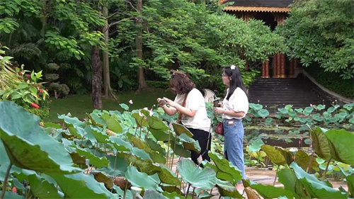 景洪市曼聽公園有限責(zé)任公司經(jīng)營服務(wù)部副經(jīng)理 楊璇:“我們的荷花園有6、7個(gè)品種的荷花及睡蓮,這幾天正是荷花盛開的季節(jié),景區(qū)比之前熱鬧了許多,很多中老年人和學(xué)生最近都喜歡在我們的荷花池邊上進(jìn)行寫生,上演旗袍秀之類的特色活動?!?nbsp;