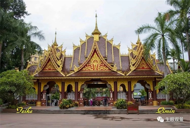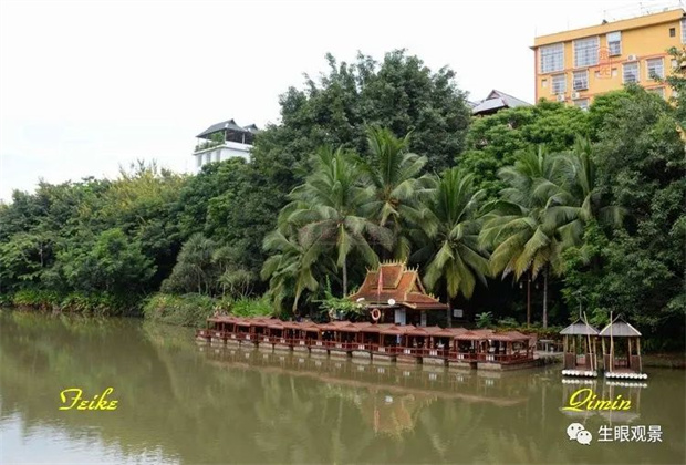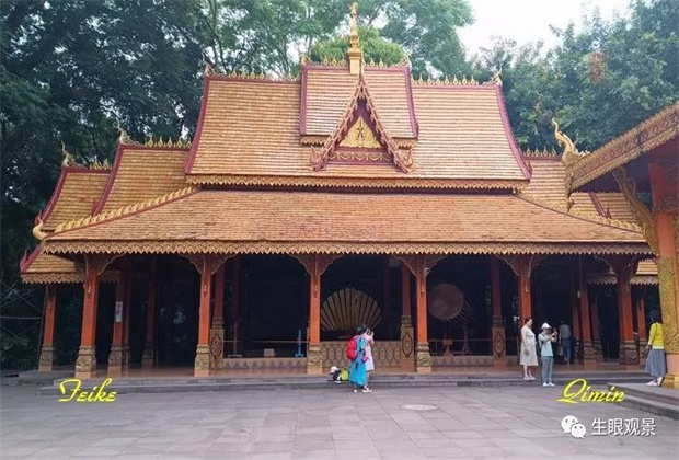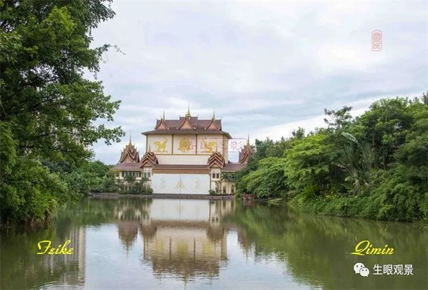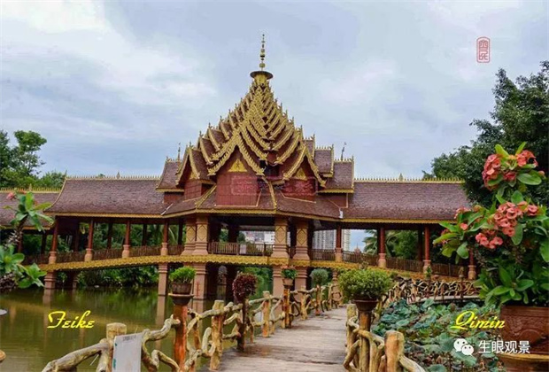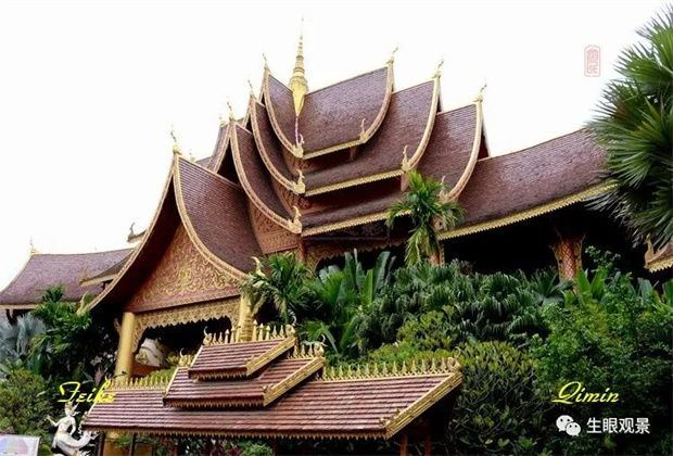 你看,那層層疊疊的橋頂,金碧輝煌的靚色,又有綠意盎然的熱帶植物、綠水碧波的放生湖水作映襯,好一幅令人心曠神怡的自然天成與人工建筑美妙結(jié)合的畫卷!