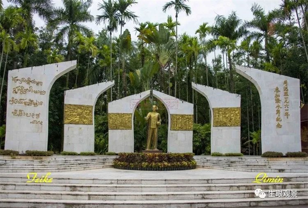進入曼聽公園的大門,首先映入眼簾的是廣場上一座紀念周恩來總理的銅像。周總理身著傣裝,左手端著水缽,右手持橄欖枝,這是六十年代初總理來西雙版納和緬甸總理會晤的時候,參加傣族潑水節(jié)時的場景。銅像左邊還有泰王國公主種下的兩株象征中泰友誼的菩提樹。