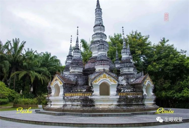 因曼飛龍白塔離景洪較遠,公園仿建了這座白塔。通體純白的塔身上鑲嵌著騰空翱翔的龍鳳,母塔尖頂銅制“天笛”隨風鳴響來自佛國的圣潔梵音,融入傣泰的異域風情,寓意是版納雨林的無瑕象征。