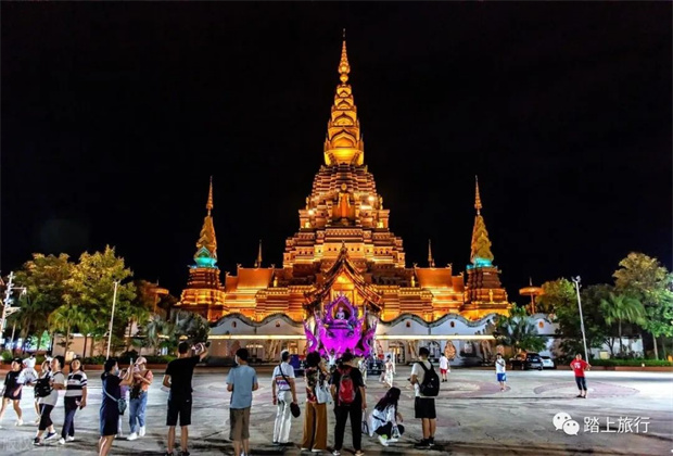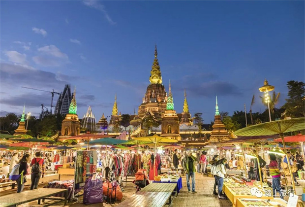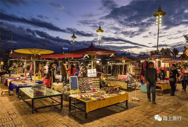 來西雙版納一定不能錯過的就是告莊的星空夜市,是東南亞最大的夜市,全長2000多米,宛如星空一般,街上掛著五彩斑斕的傣式燈籠,古色古香的油紙傘,游人來往如織。在星空籠罩下的大金塔光彩奪目,熠熠生輝,如夢如幻,整條街道沐浴在人間煙火之中,生機勃勃,熱鬧非凡。
